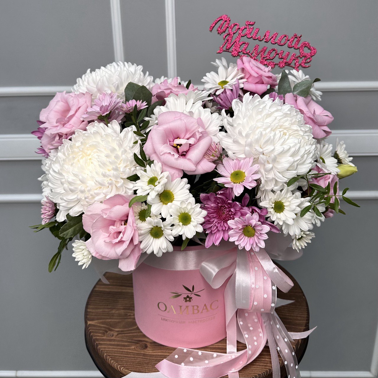 Нежная шляпная коробка из эустомы и хризантемы #337