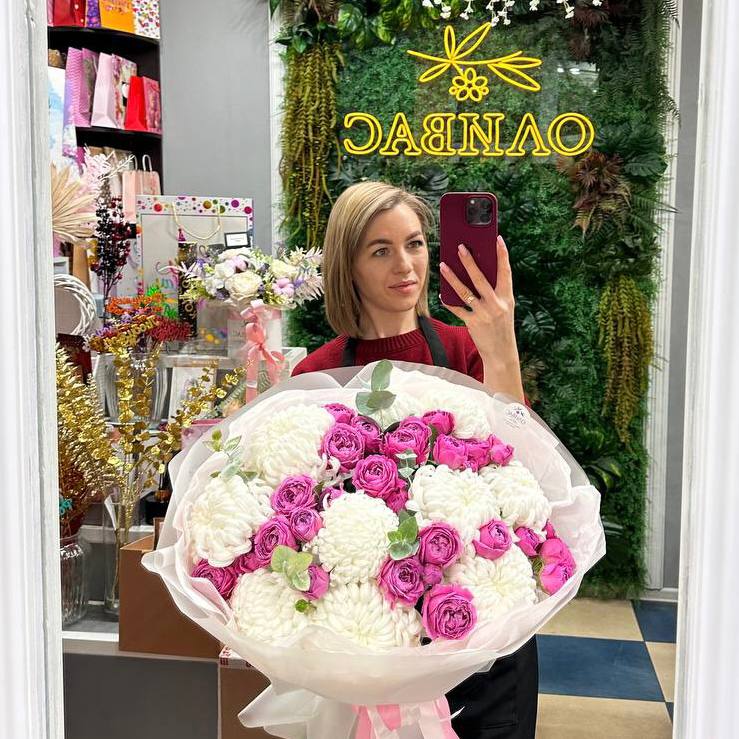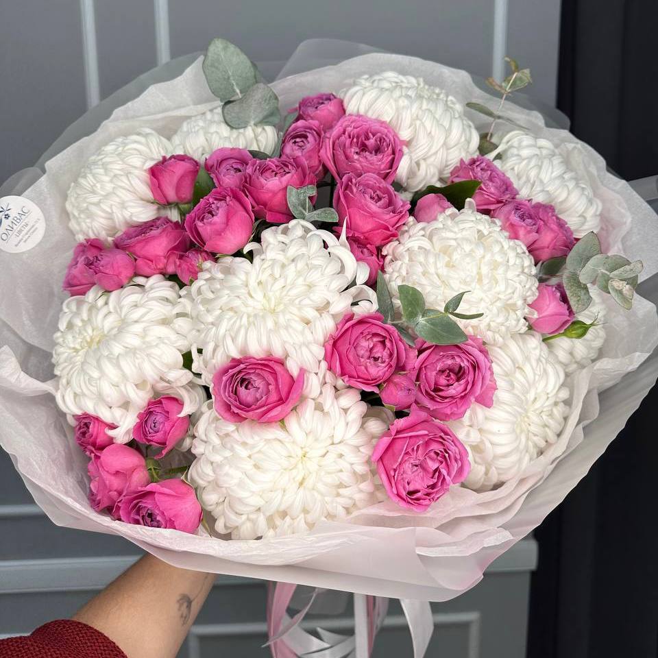 Красивый букет из белых крымских хризантем и кустовых пионовидных роз сорта Мисти