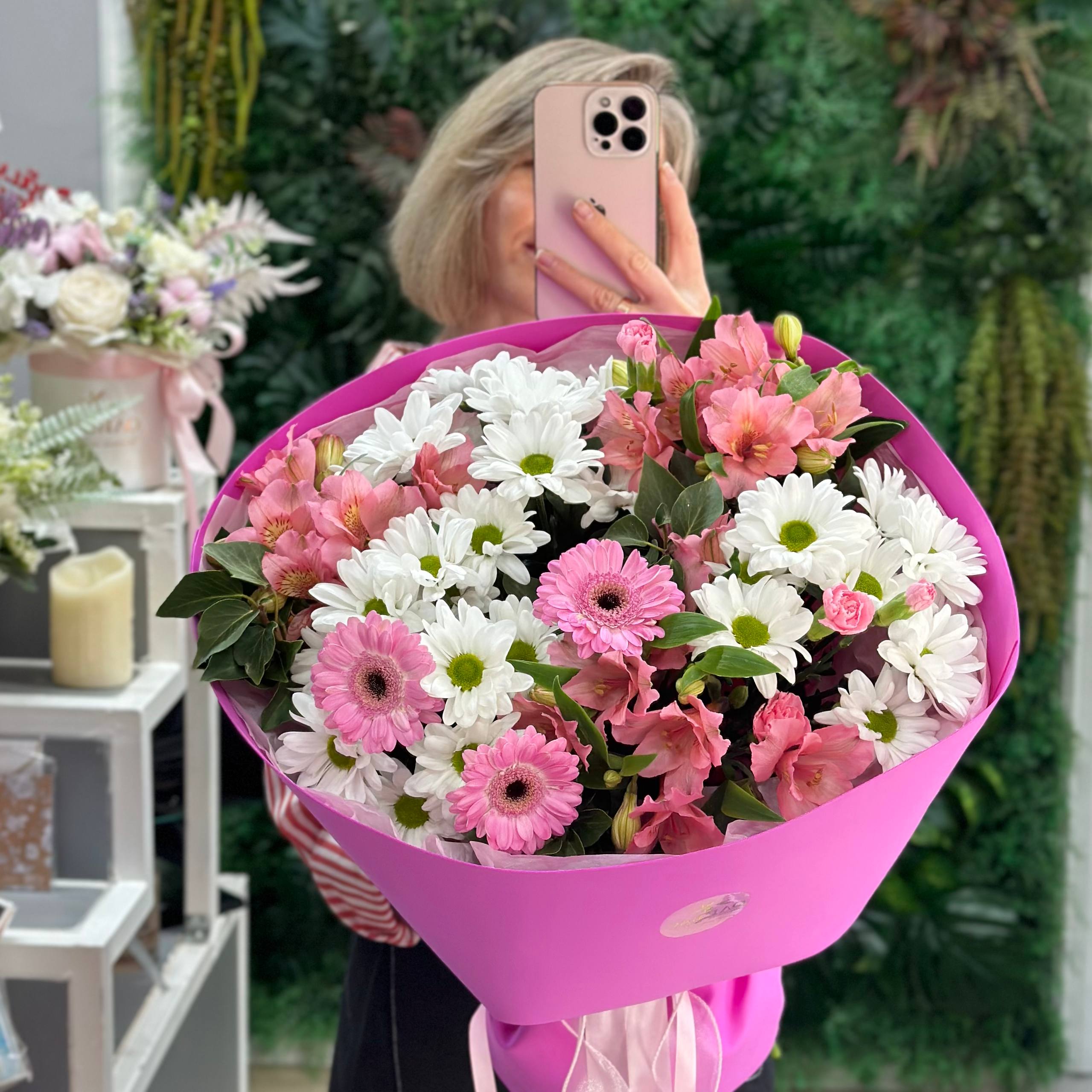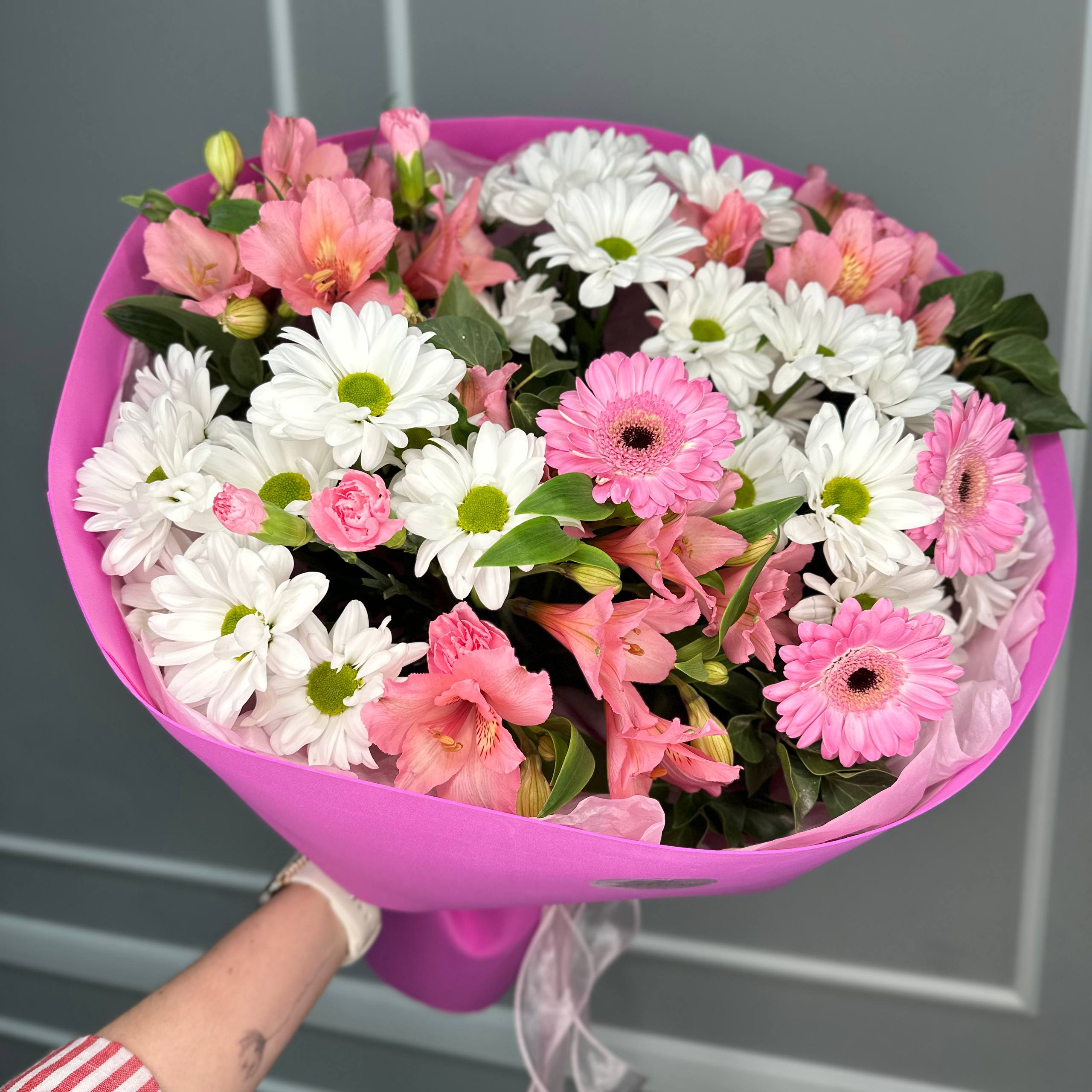 Милейший букетик из стойких хризантем, альстромерий и мини-гербер