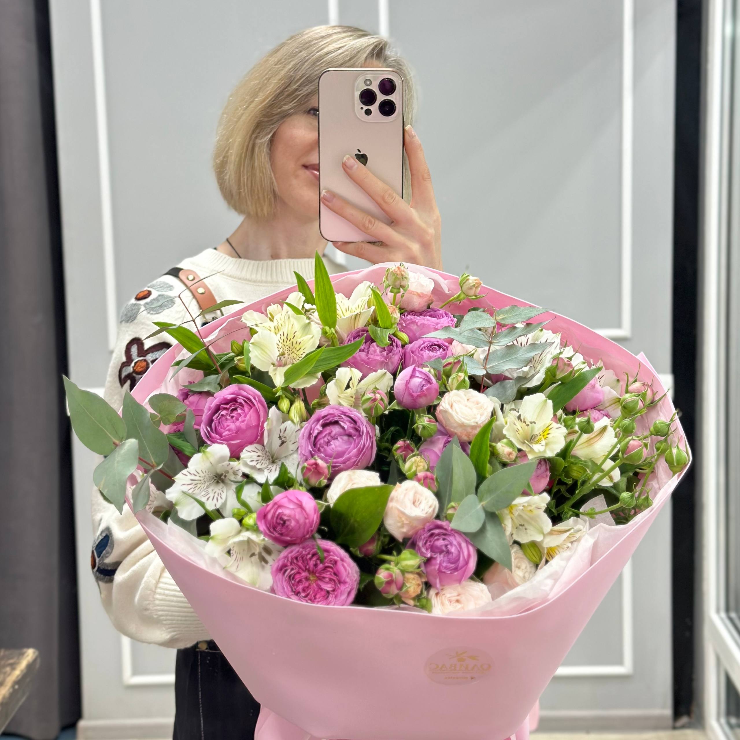 Шляпная коробочка ароматной пионовидной кустовой розы сорта Мисти Баблз #384