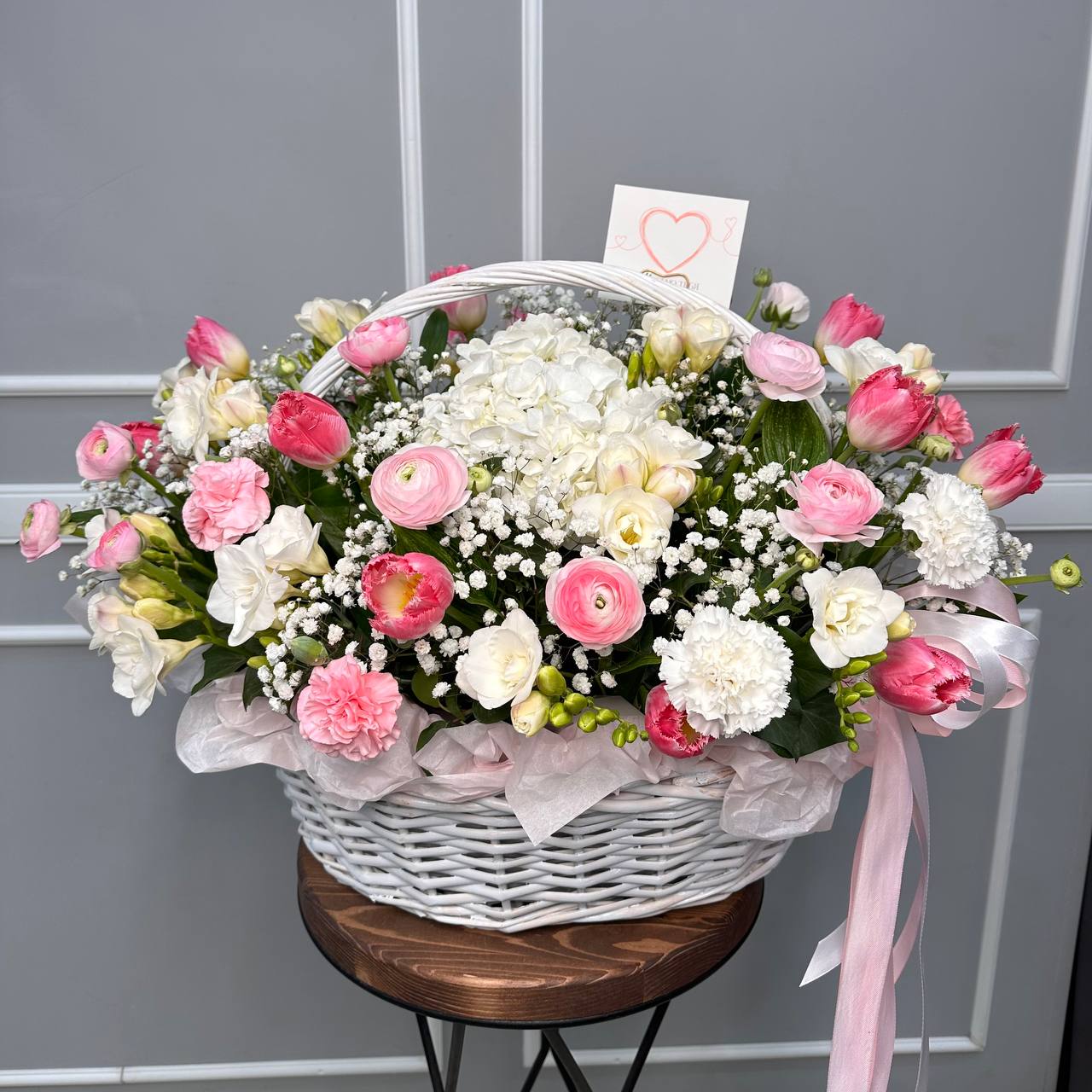 В составе ранункулюсы, тюльпаны, фрезия, гортензия, гипсофилы. Цветы в данной корзине сезонные, поэтому уточняйте у менеджера, возможность изготовления данной работы на вашу дату.