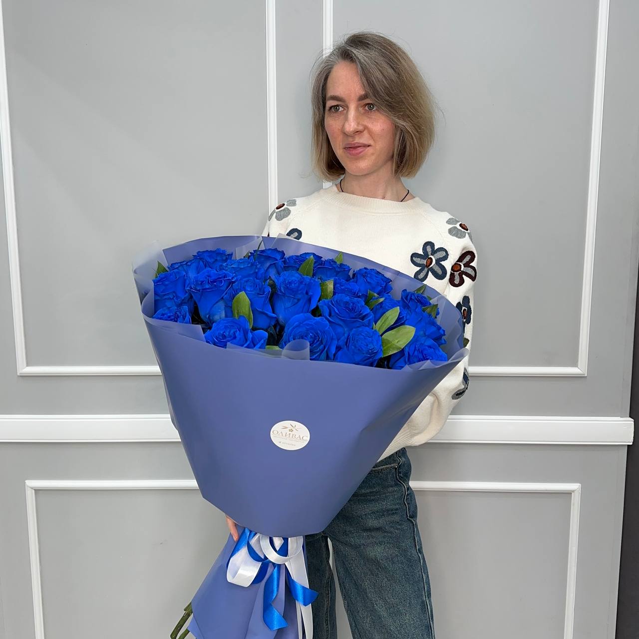 Синие розы привозим исключительно по предварительному заказу (за 3-6 дней), в наличии их нет. Минимальное количество для заказа, 23 розы. Уточняйте у менеджера возможность изготовления данного букета на вашу дату.