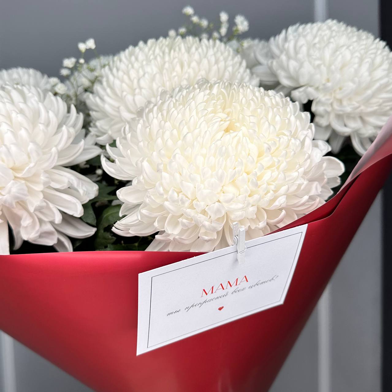 Белоснежные хризантемы в коробочке для мамы