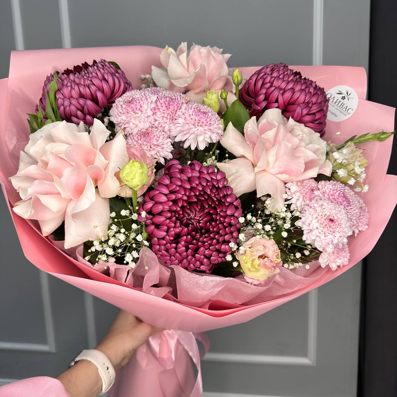 Элитный букет из французских роз  и хризантем сорта бигуди