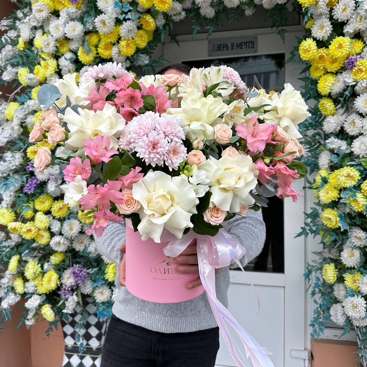 Огромная коробочка из кустовых и французских роз, с добавлением хризантемы и альстромерии. Шикарный подарок для близких людей!