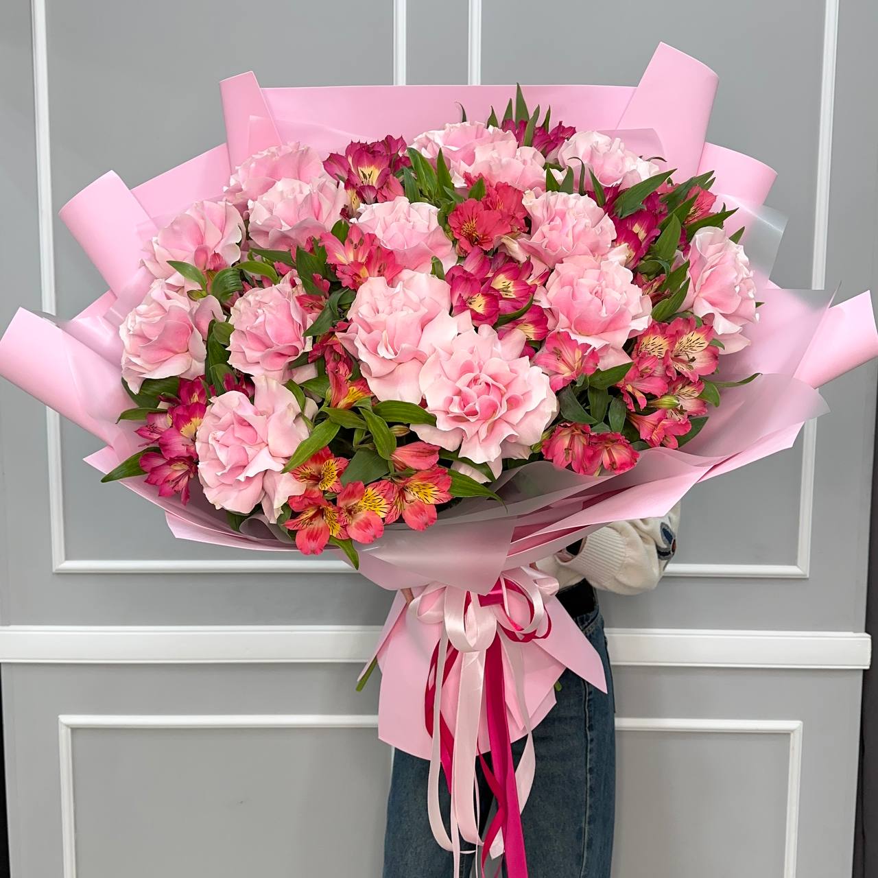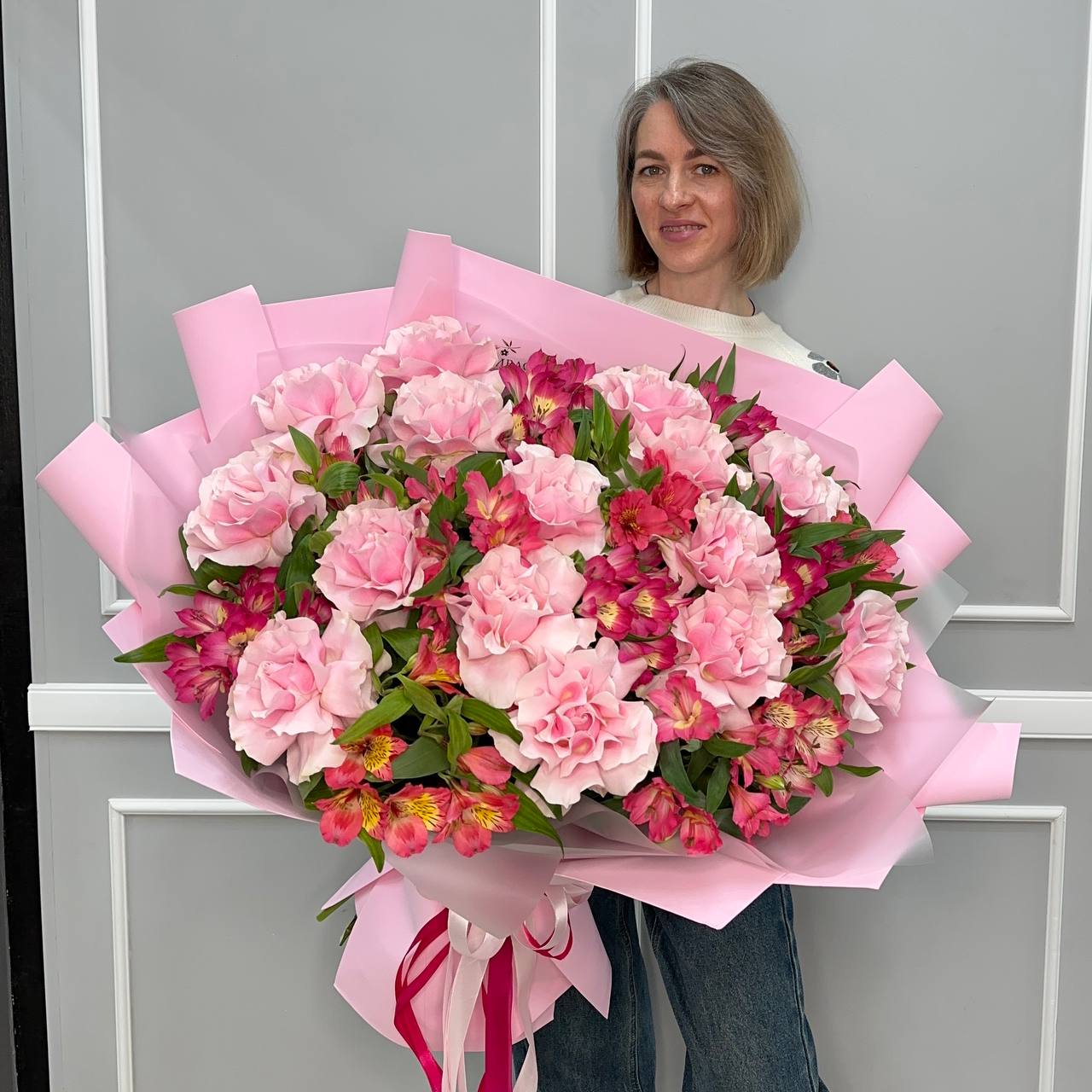 Впечатляющий, нежный букет с французскими розами и алсьтромериями
